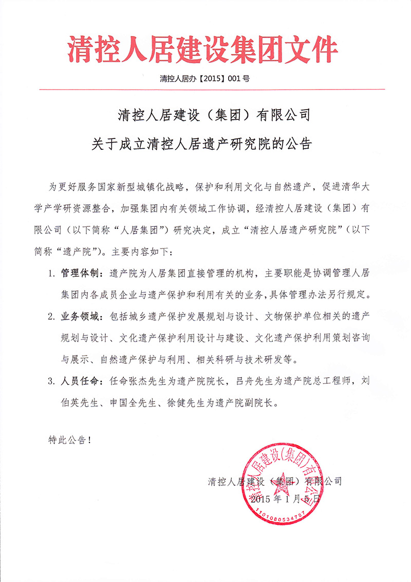 为更好服务国家新型城镇化战略,保护和利用文化与自然遗产,促进清华大学产学研资源整合,加强集团内有关领域工作协调,经清控人居建设(集团)有限公司(以下简称“人居集团”)研究决定,成立“清控人居遗产研究院”(以下简称“遗产院”)。主要内容如下: