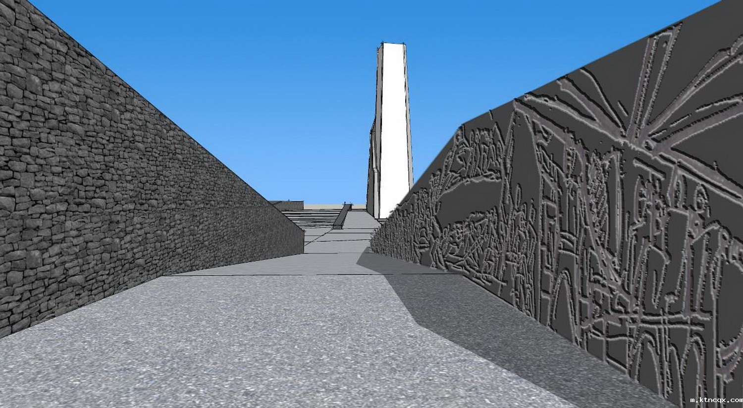 南园以象征手法表现了两组景观:一组以下沉广场和错落的景观墙表现了塌陷沉降的土地、崩裂的山石和倾垣的建筑;一组以跌宕的岩石景观喻指山城北川的旧貌,以高踞的纪念碑喻指北川羌寨傲然挺立的碉楼。贯穿纪念碑广场的主叙事轴线,由雕塑墙、特殊的广场铺装线与尽端的纪念碑碉楼构成,形成一条历史的隧道,以浮雕碑刻与签名刻字纪念墙的形式述说着北川重获新生的历程。