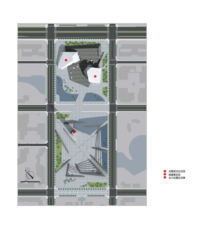 北川是是5.12汶川大地震中受灾最为严重的地区之一,也是震后异地新建的县城。北川抗震纪念园坐落于新县城的中心,是文化中轴线与永昌河城市绿带的交汇点,占地面积约为5公顷,西南方紧邻羌族风貌商业街,东北端与文化中心用地相接。在场地范围中需要对纪念碑广场以及北川抗震纪念馆、城市规划展览馆两座小型展馆建筑进行规划设计。
