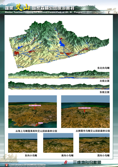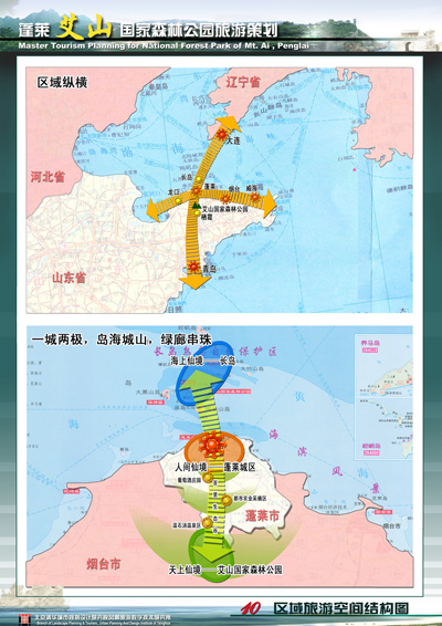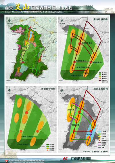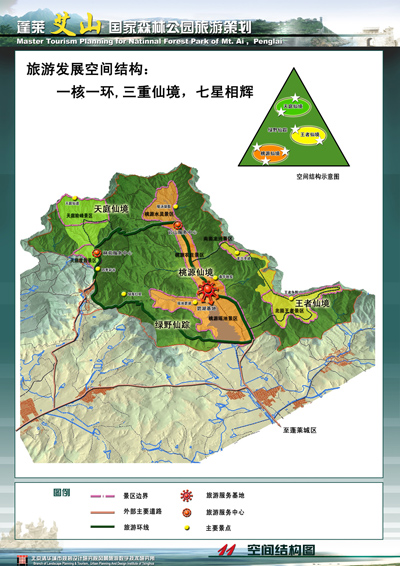 贯彻“顶天立地”的规划原则。规划把握住海滨观光和度假旅游将成为蓬莱城区的主要品牌,因此提出艾山以“休闲旅游”为核心的产品体系。包括天庭仙境游、王者仙境游、桃源仙境游、绿野仙踪游等,从而与蓬莱市区互为映照,互为补充。