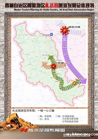 针对札达旅游基础较为薄弱,旅游发展处于起步阶段的现状,规划提出“双遗产申报战略、旅游目的地战略、交通突破战略、服务攻坚战略、点线转型战略、永续利用战略”六大战略;以托林镇为核心,构建“一核一心三轴”的空间格局;重点发展“古格文明遗产游”、“札达土林奇观游”、“象雄文化遗址游”、“藏俗风情体验游”四大主题产品;通过“九个一”工程(一个世界双遗产、一套旅游标识导引系统、一个旅游网站、一个四星级宾馆、一个游客中心、一个旅行社、一组星级冲水厕所、一条旅游民俗风情街、一套旅游保险制度)的建设,夯实札达旅游发展基础。