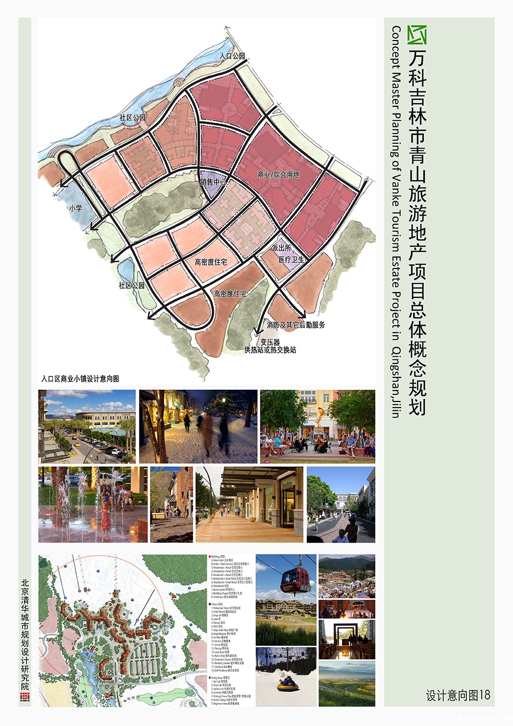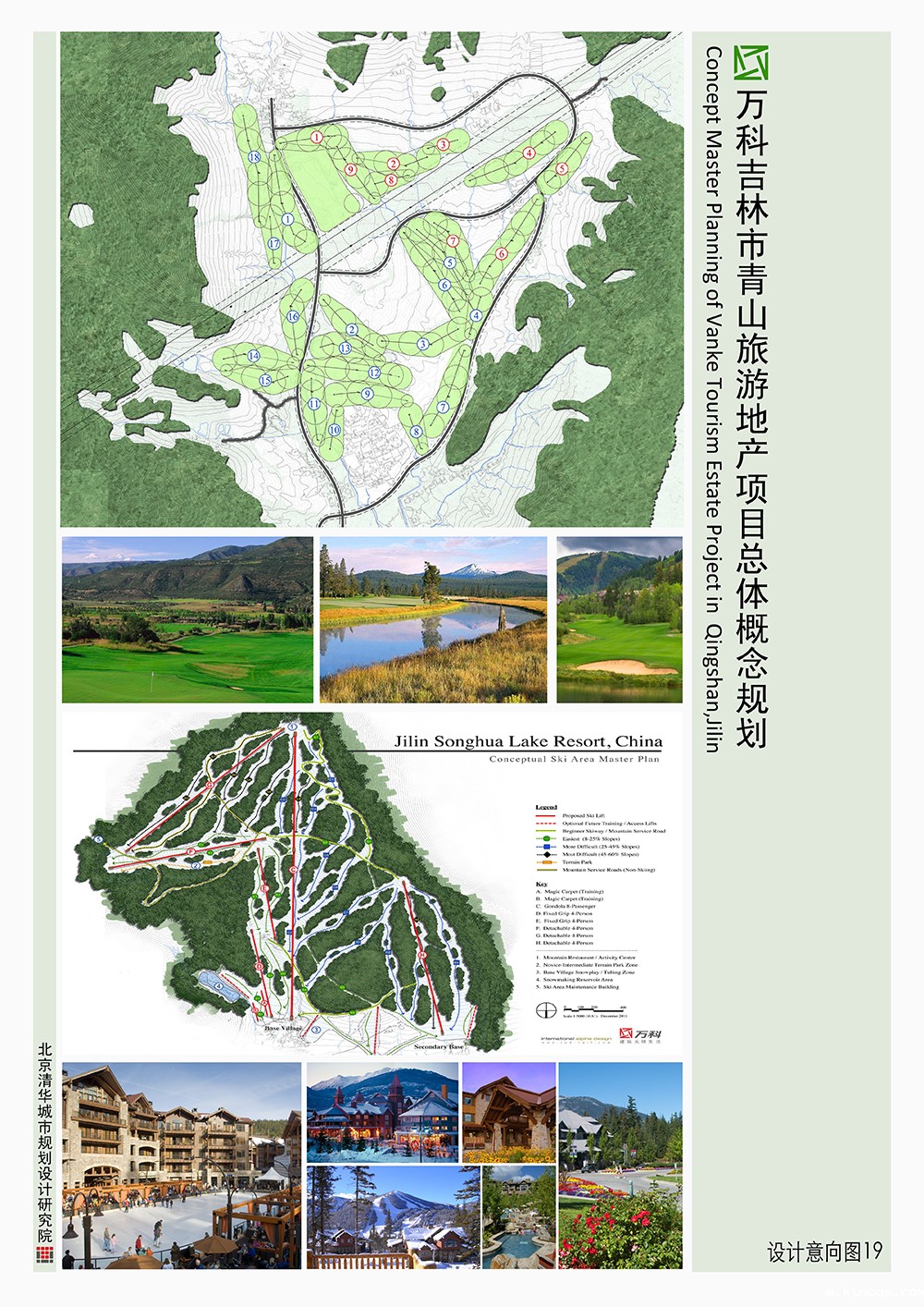 规划在空间布局上采用组团式的布局原则,尊重地形和自然肌理,保证绿地水域空间与建设空间的相互渗透,以达到步步有景,人工环境与自然环境相融合的空间效果。用地布局整体呈现滑雪运动、度假小镇、自然小镇、宜居小镇、购物小镇五大功能板块,形成“一核四镇,一带多环”的空间布局。区内设施包括滑雪场、酒店、滑雪服务设施、商业服务、餐饮服务、温泉美容、会议中心、溜冰场等旅游产品,以及其他春夏秋冬不同季节均分别为旅游区提供亮点的娱乐休闲设施。另外,规划对片区内的交通组织、土地利用、旅游服务设施、绿地景观等专项设施进行了统一的安排和布局。并进行了实施的分期规划,提出近远期相应投资框算。