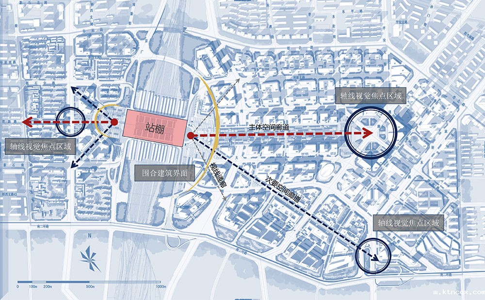 3、客站城市景观地位提升:通过两条斜向开放空间轴线的引入强化新客站的城市景观核心地位,加强城市主干道与新客站之间的视线联系。避开质监局的高层建筑带来的视觉影响。引导视线向新的轴线方向集中