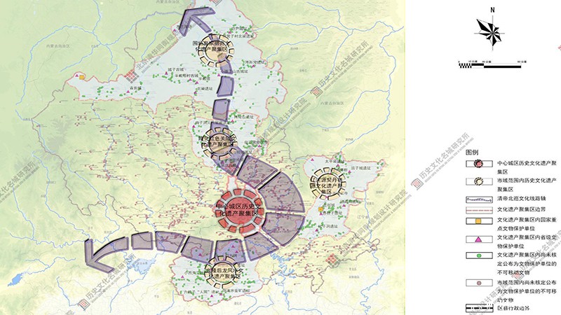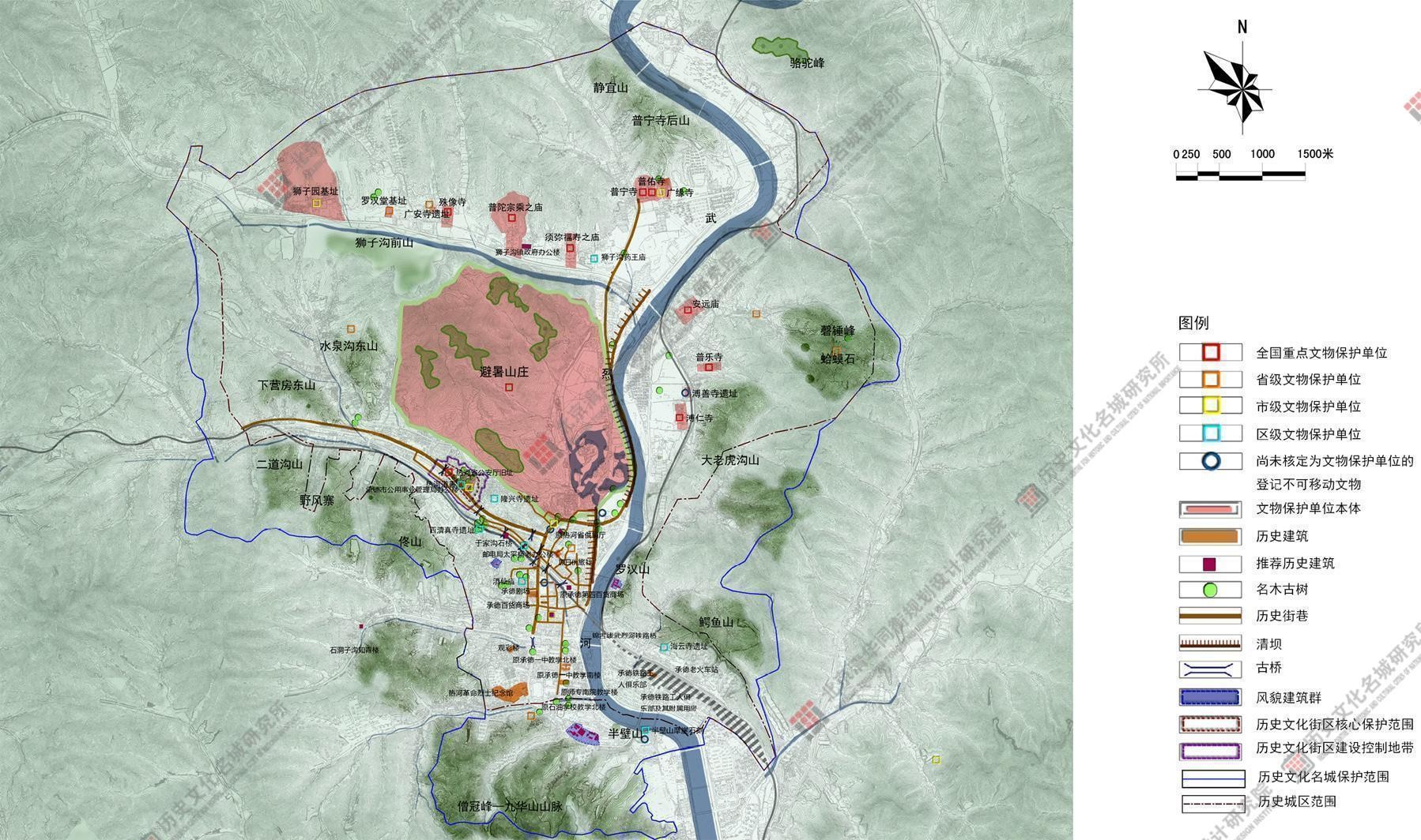 针对以上问题,本次规划在系统价值认知的基础上,全面梳理保护要素,构建了“一核、一轴、四区、两片”的市域保护体系,以及“城区外庙拱卫山庄,三水两轴群峰环绕”的历史城区保护体系。并形成价值认知、三规合一、高度控制、色彩协调、城市建设五个方面规划研究成果。规划的创新点如下: