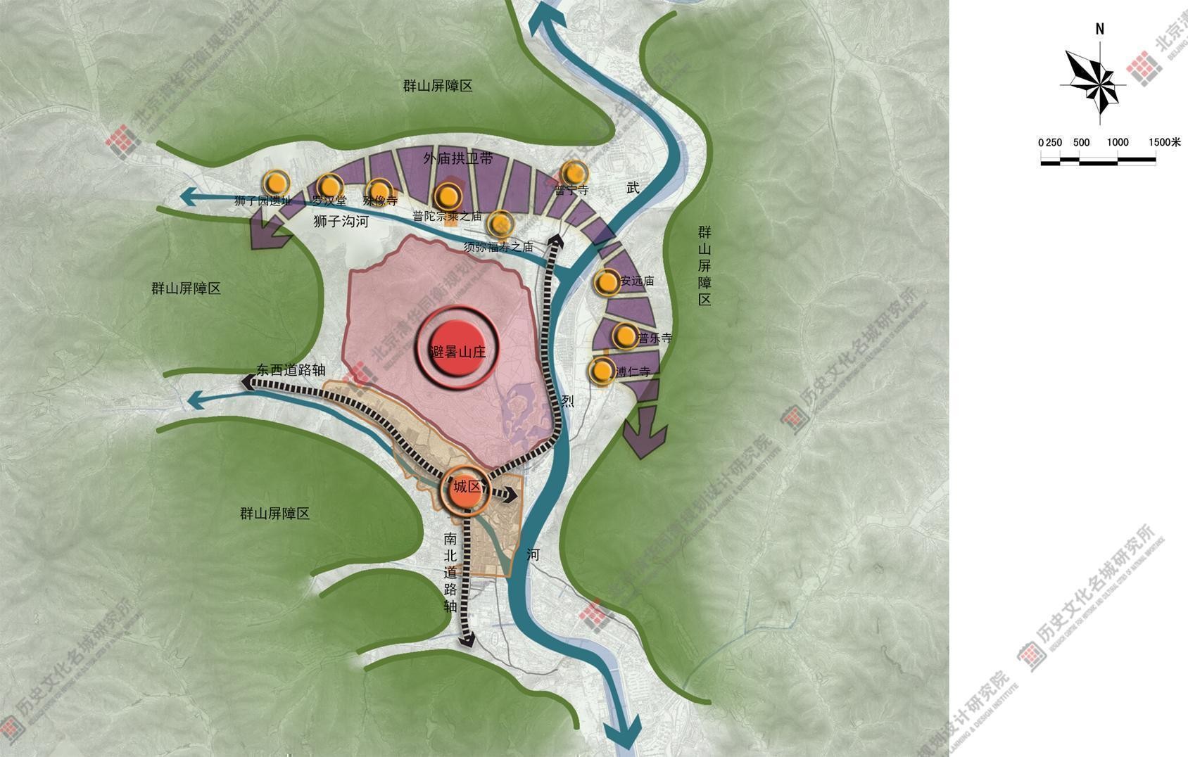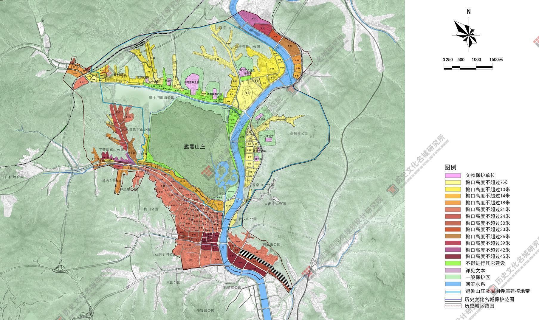 4、明确风貌及色彩控制区划与要求,以山庄外庙的世界遗产为核心,实现“保安全、显特色、促协调”的分区色彩控制。