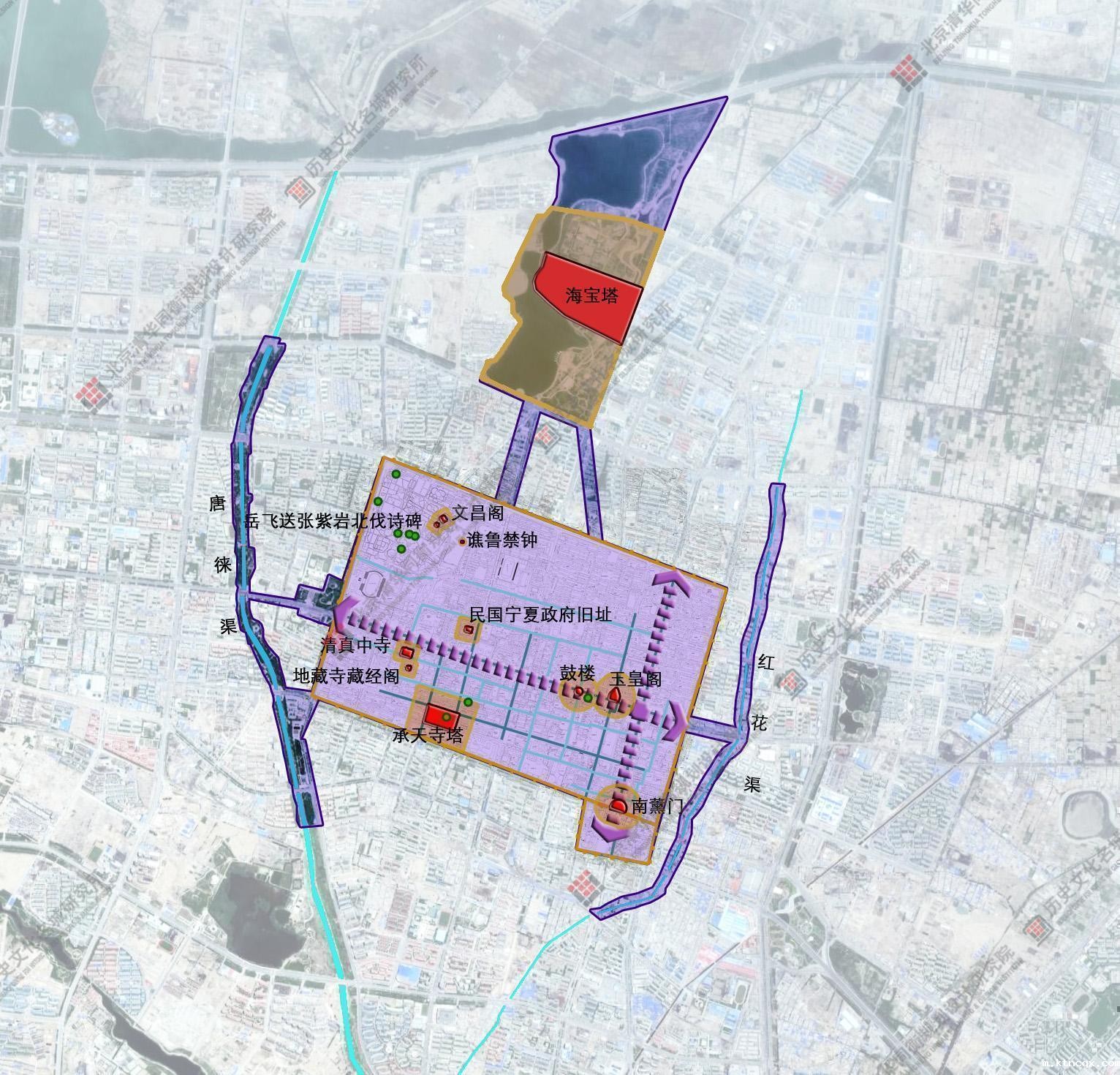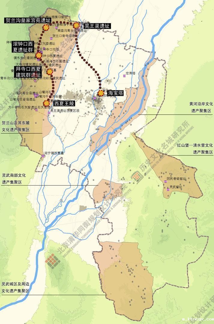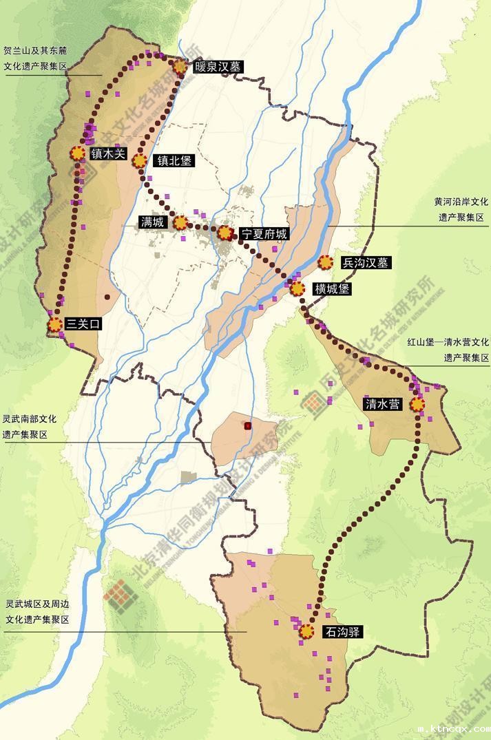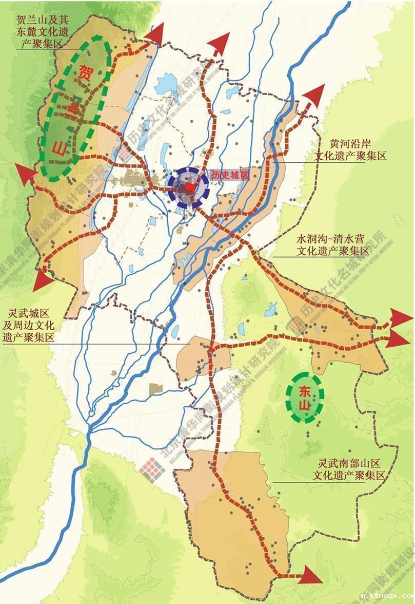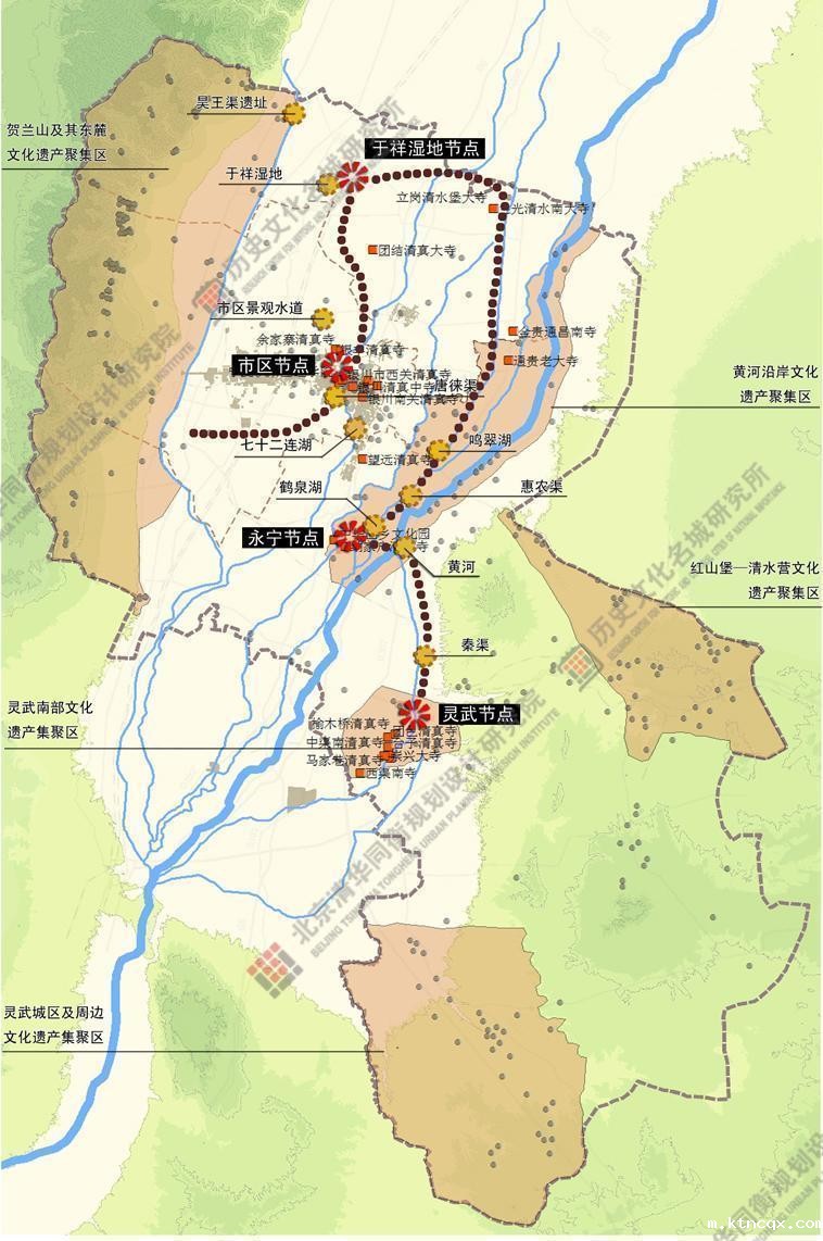 1、市域层次:确定“山、河、渠、湖、城、一条文化线路段落、五个文化遗产聚集区”的保护结构,并对相关遗存提出保护措施,结合文化遗产资源现状,设计了西夏文化、历代边防文化、回族风情和塞上江南四条展示线路;