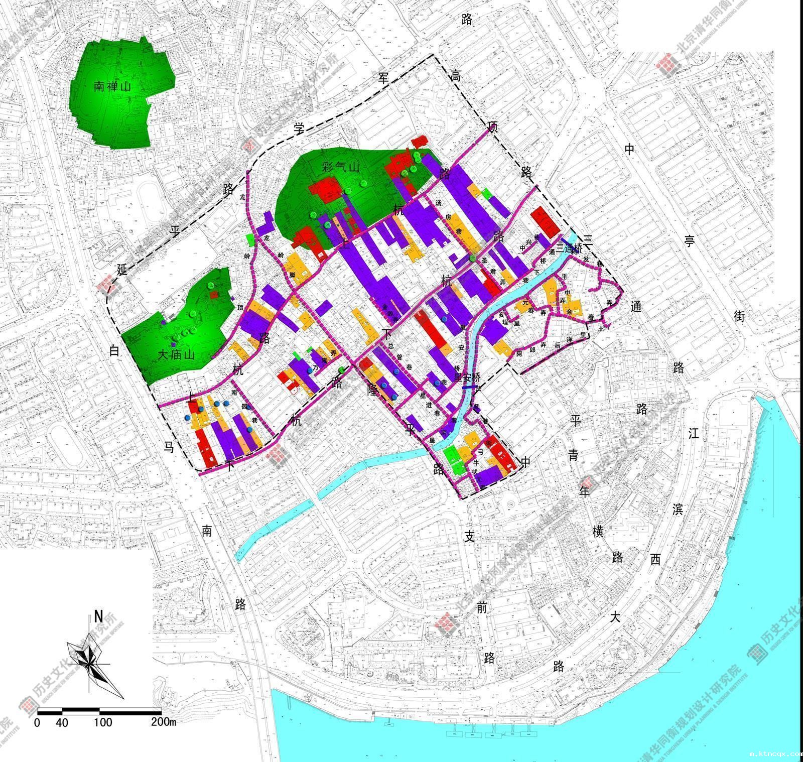 本次规划借鉴了ICOMOS在《关于城市历史景观建议书》中提出的城市历史景观的新概念与新方法。鉴于上下杭具有文化、自然等多元复合的遗产,并在历史上层层积淀,城市历史景观特征突出,规划引入历史学、地理学、社会学、建筑学等多学科研究,对街区进行“考古”,即将街区各类遗存、优秀传统文化及非物质文化遗产放在街区发展的社会、经济、文化背景中,试图解读遗存与街区相关背景的联系,构筑反映街区价值的文化遗产网络。