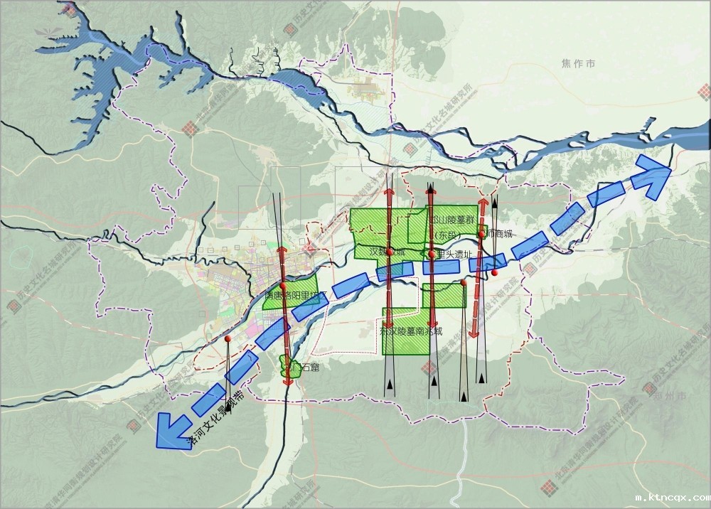 规划在深入梳理洛阳城市肌理,对洛阳历史文化遗产价值评价的基础上,提出了历史文化遗产的整体保护策略。根据洛阳历史文化名城特色及保护主题,结合历史文化遗产的空间分布特征,确定洛阳整体区域特色保护结构为“山、河、城、两条文化线路”。其中以伊、洛河两岸各都城遗址为轴筑起洛阳名城保护市区层次的宏观框架,而山、河是框架中不可或缺的自然环境烘托元素。