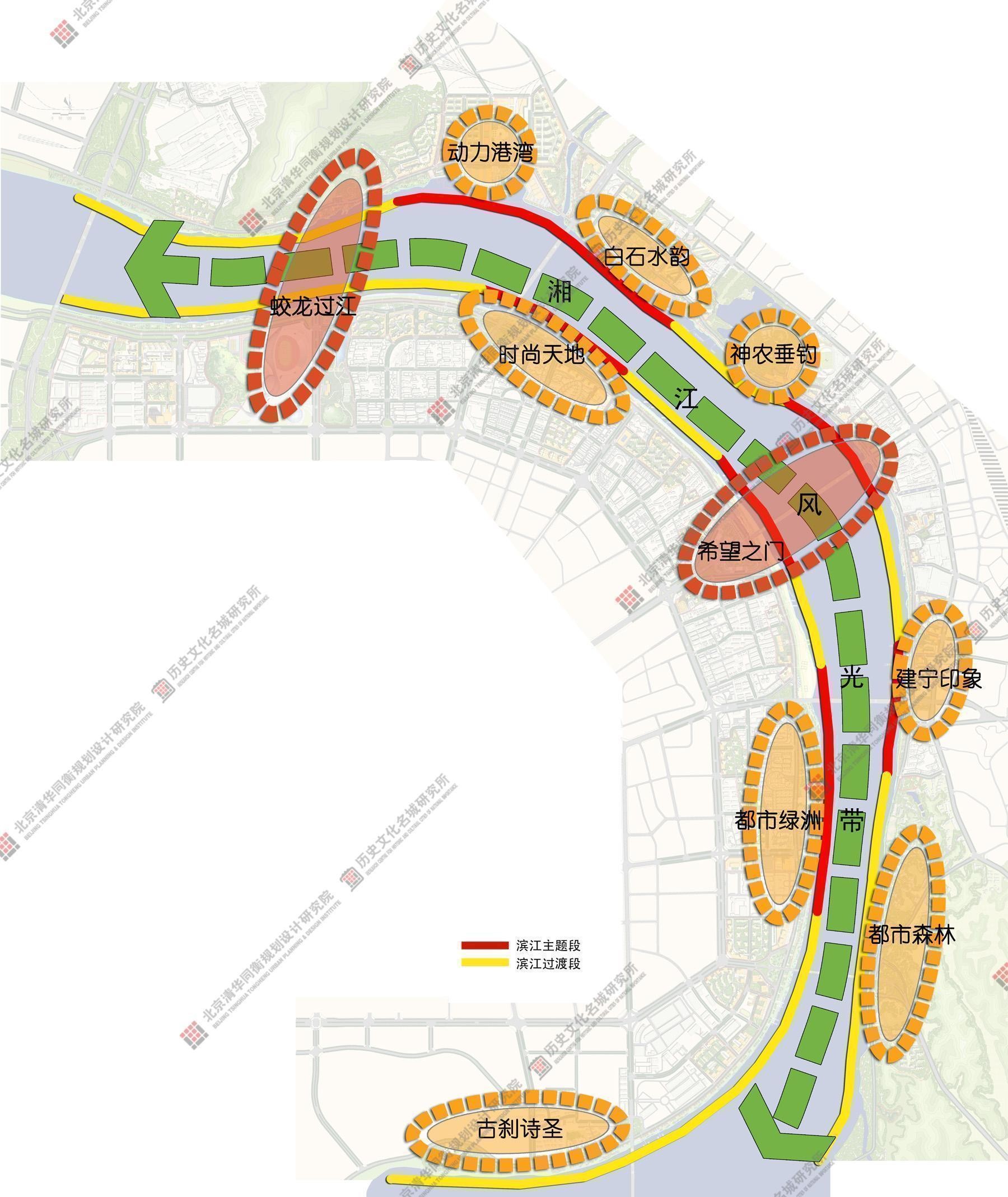 本次规划以滨江地区的文化资源为基础,提出了十大创意,分别是:蛟龙过江、动力港湾、白石水韵、神农垂钓、希望之门、建宁印象、都市森林、古刹诗圣、都市绿洲及时尚天地。将传统的历史文化资源与自然景观和谐相配,以点带线,以十大创意节点为统括,构成现代城市具有内涵的文化创意景观,形成“一江两岸、十段十景”的景观整体结构。
