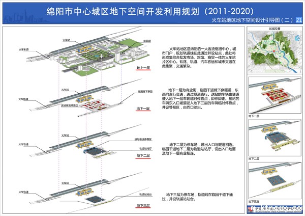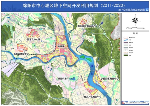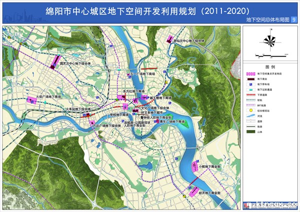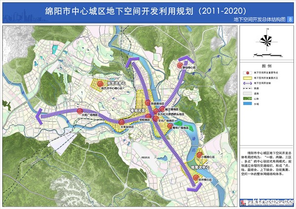 规划确定绵阳市中心城区地下空间开发总体布局结构为:“一核、两轴、三区、多点”的中心联结式布局结构。到规划期末,绵阳市中心城区地下空间需求规模约为530万平方米。确定地下空间重点建设区域包括老城区的文化广场地区、火车站地区和跃进路地区;园艺片区的园艺次中心核心区;城南次中心的经开核心区和小枧核心区;高新区的火炬广场地区和游仙片区的游仙核心区。最后对火车站地区、党校地区、文化广场、跃进路地区、园艺次中心核心区、城南次中心核心区(包括经开核心区和小枧核心区)、游仙核心区、青年广场、越王楼、东方红大桥西桥头、火炬广场、五一广场十三个节点地区进行了引导设计。