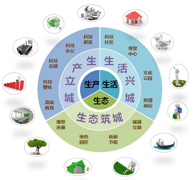 策划理念:“科技新城”理念,“三生合一”理念