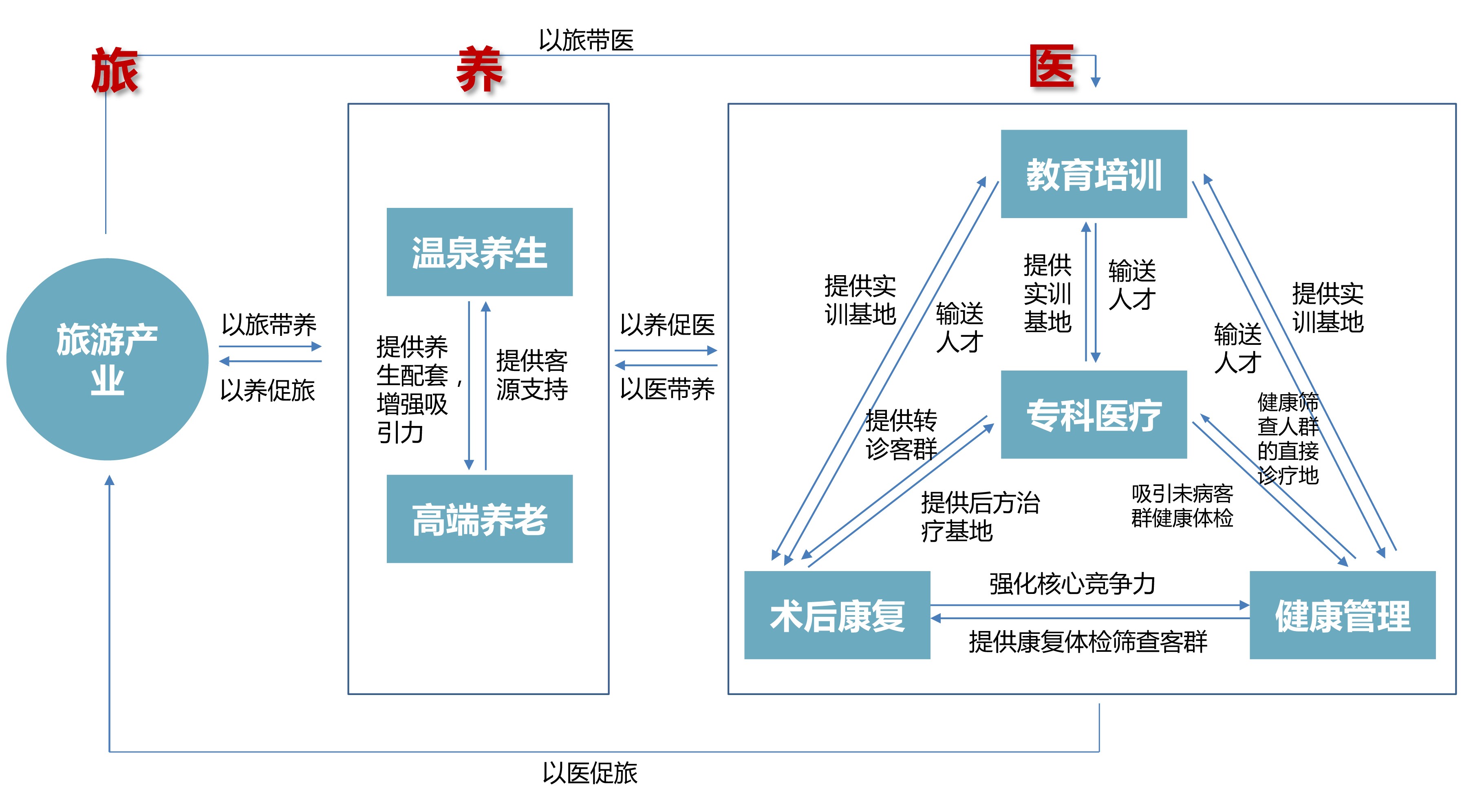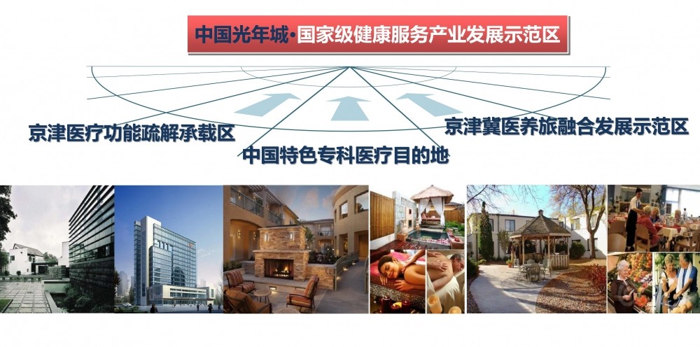 我们主要从地块属性界定、机遇挑战分析、产业研究筛选、重点产业策略、以及产业模式五个板块,对光年城健康医疗养生产业发展展开了研究,提出中国光年城健康服务业应该重点培育专科医疗、健康管理、术后康复、高端养老、温泉养生、教育培训六大产业方向,对接京津冀一体化,承担起建设京津冀一体化京津合作示范区的使命,打造京津医疗功能疏解承载区、中国特色专科医疗目的地,京津冀医养旅融合发展的示范区。从产业发展策略来讲,策划研究成果提出中国光年城应当以“强专科、小综合、精康养”为路径,实现医旅联动,医养联动、医防联动、医教联动,打造“3H”(家庭式的温馨,酒店式的服务,专业性的医护健康服务)健康服务业示范园区。