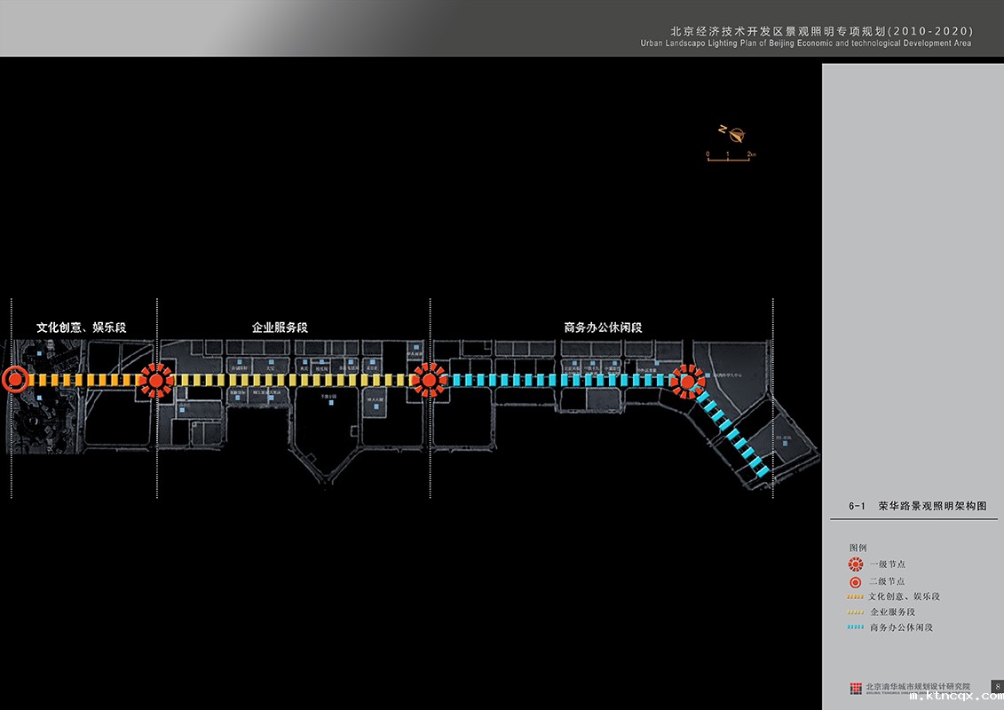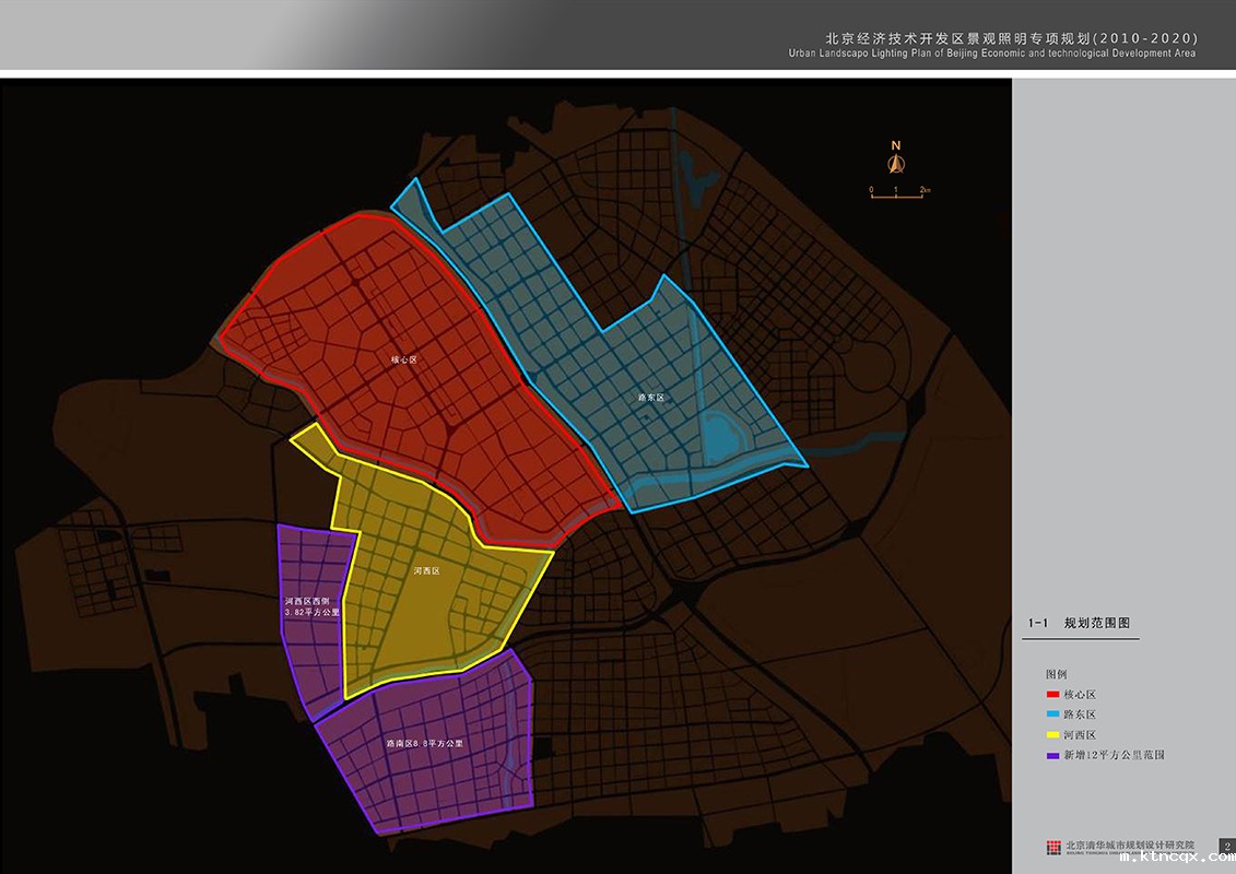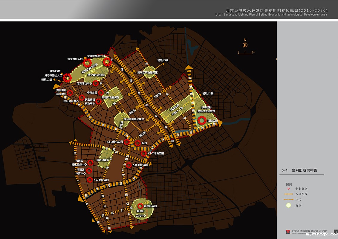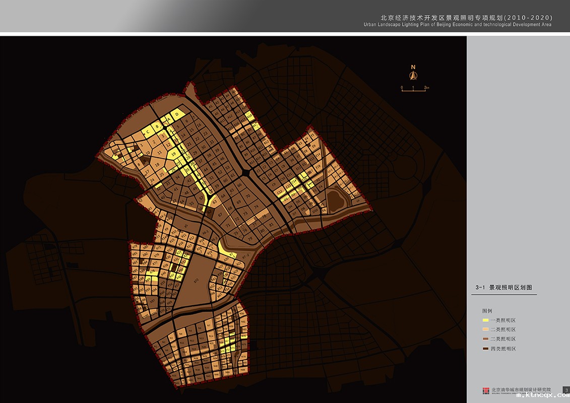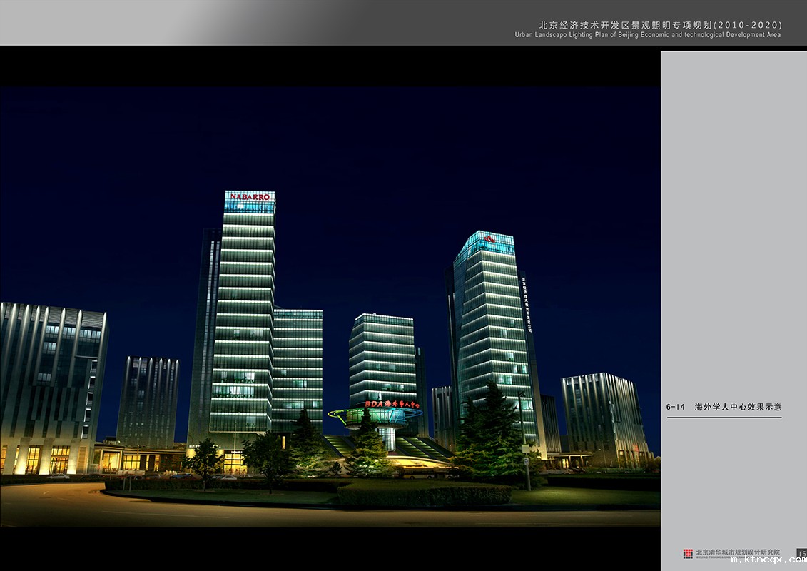 北京经济技术开发区是以跨国公司和高新技术产业为主的新经济区,为了实现开发区的建设目标,进一步突出开发区作为现代制造业和高新技术产业化基地的定位,为开发区创造国际一流的环境,本项目对开发区的夜景观与环境照明做出了统一规划,并提出管理和设计的依据,确保了开发区照明满足安全安保、城市形象和环保节能的要求。 为了实现规划目标,设计从城市的道路、建筑、景观、以及户外广告等方面做了针对性的处理,在创造良好的夜间形象的同时也注入了先进、环保的照明技术手段。同时,使开发区夜间有一个清晰的城市意象和空间架构,形成积极的城区性格和形象,考虑不同视点的视觉感受,加强其信息给予度。夜景观总体布局以开发区的总体规划为依据,以开发区的现状和建设动态为基础,包括对车行道、自行车道、人行道,公园、建筑物、构筑物、雕塑、喷泉以及其他景观的照明。形成点、线、面结合,层次分明,动态伸展的公共照明体系。同时合理选择照明设备的布局、尺寸、形状和光色,清晰体现照明体系的等级。 在公共交通照明方面,本案打破传统, 与国际接轨,对新城区的道路照明进行了新的探索,将国家道路照明标准与国际照明协会照明标准有机结合于设计中, 使公共交通照明体系更科学,环保与节能;在建筑照明方面,提出照明分级制度,依照开发区建筑的性质、位置和对夜景观影响等诸多权重因素,确立照明对象,并加以排序,形成有效的建筑照明体系;在景观照明方面,为开发区公共景观要素的固定照明提供了设计依据,利用景观要素来界定室外空间,通过强调景观要素来营造有吸引力的夜间环境,增加了室外夜景观的空间深度与层次,使人在户外环境工作或休闲感到更安全,更舒适;在广告标识照明方面,针对开发区开放空间内可见的新建发光广告标识,提出了控制依据,对夜景重要组成部分的广告标识照明,进行了优化与限制,整合了城区内照明环境的秩序;除了对主要的照明要素进行了设计分析,为了实现开发区夜景照明的可持续发展,还提出了对已经建成和待建的项目进行科学有效管理的原则和措施。