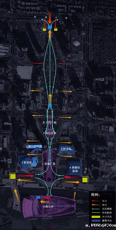 新中轴:作为城市形象轴,以中性白光为主,表现兴奋、现代的都市特色。与城市道路基底照明的暖黄色区分,同时通过对地标建筑的高亮度照明,突显并强调轴线的自身特色。沿新中轴从北往南,对照明动态的限制逐渐放松,最后在海心沙岛和广州电视塔达到动态变化的高潮。