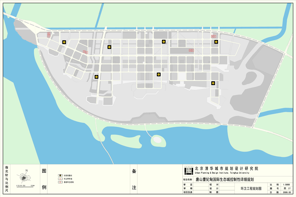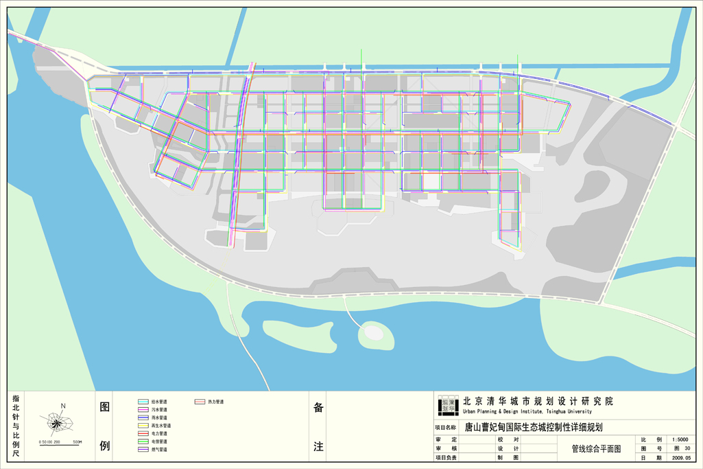 在市政规划中,起步区实行分质供水模式,优质水主要用于居民生活及公建用水,再生水用于居民及公建冲厕、市政杂用水。从而达到提高水资源利用率,节约水资源的目的。规划通过屋面雨水收集利用,雨水下渗补充地下水、绿地及道路径流雨水的收集利用、低势绿地、透水地面等,对雨水进行综合利用。同时采用雨水管网收集,结合起步区的城市设计,建立建筑屋面-路面、绿地-地块内部蓄水池-市政雨水管道—河道的雨水集蓄、利用系统。地块内部分散利用后的多余雨水进入市政雨水管道或地块周边水体,市政雨水管道收集的雨水就近排入河道,进入水体的雨水作为生态补水,也可用于绿化用水等。同时发展起步区的太阳能和风力发电的应用,发展地源热泵、燃气三联供等方式,形成与常规能源相互衔接、相互补充的能源利用模式。同时分析了起步区的开发时序以及各种管线的建设时序,合理安排了管线的平面及竖向位置。