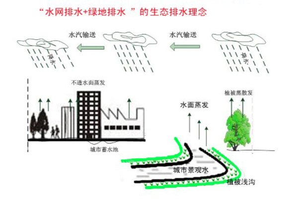提出“水网排水和绿地排水”的生态排水理念;采用了水网、绿地和管网互补的排水模式,充分利用城市水系和绿地进行雨水蓄留或排除,实现节约水资源、营造水系景观的效果。