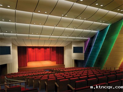 小型剧场观众厅面积411平方米,舞台面积210平方米,观众座椅484座,全部为软包座椅。功能:以演出为主,满足集会、聚会,并兼顾电影放映。