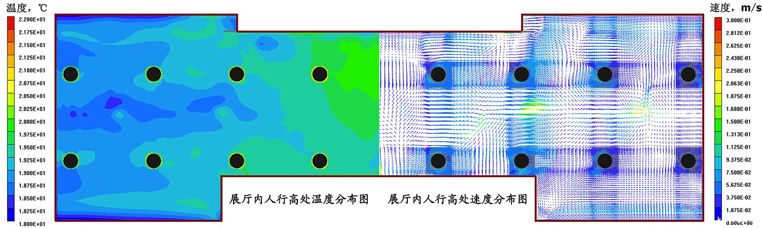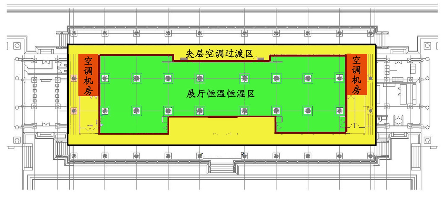 本项目空调设计立足于文物古建保护和展品保护两个方面:为了避免因其穿越过午门正楼围护结构而对文物古建造成损害和影响,采用将空调机房设置于午门正楼内的方案。只利用午门正楼的镂花窗口进行必要的空气交换,并利用地梁结构空间,采用地板静压箱送风和两侧风管回风的形式,以免对正楼顶部天花造成视线遮挡。将正楼内展厅设计为两层空间,展厅围护结构与原正楼围护结构之间的夹层为过渡空间,设有空调系统对其进行恒定温度控制,以消除外围护结构冷热负荷对展厅的影响;而在内部玻璃展厅,空调系统仅负担消除室内人员及设备热负荷,较为容易实现恒温恒湿控制。