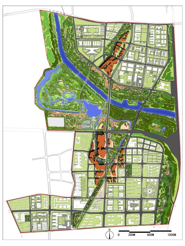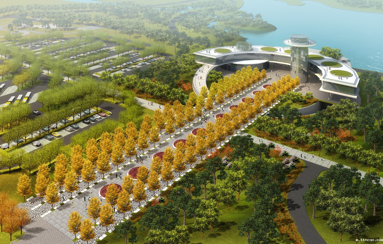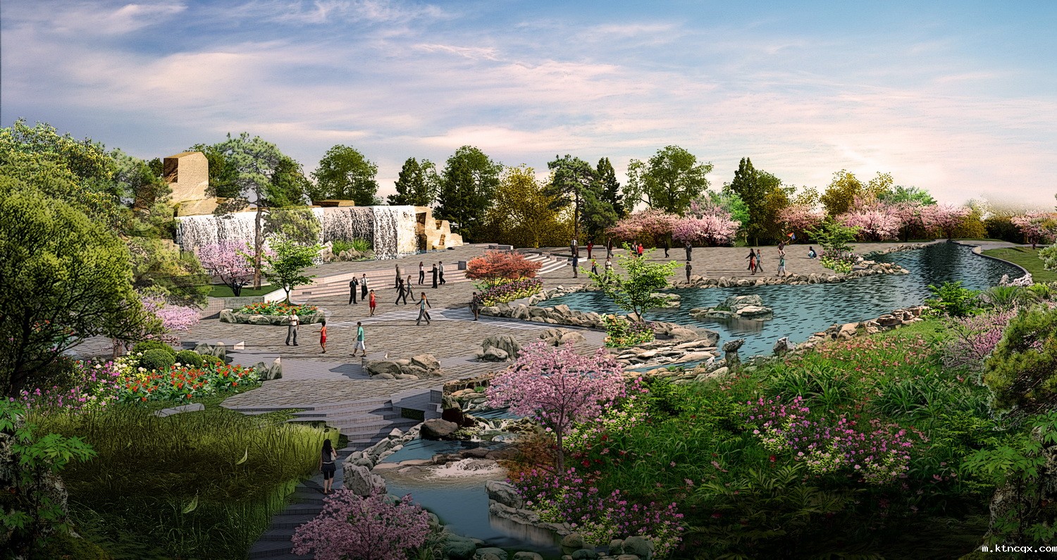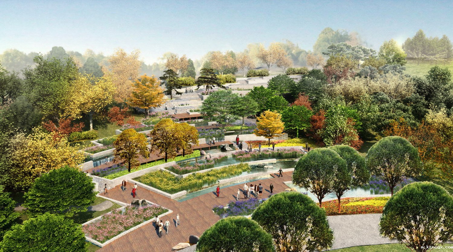 公园总体格局从整个城区范围出发来考虑,借鉴中国传统理想风水模式,处理公园中山水关系。主山位于西南侧,主水面靠近城市核心区,营造出具有主次高低之分和包合空间的山体,含有小瀑布、跌水、溪流、湿地、主湖等不同形态的水体,形成与核心区遥相呼应的景观形态。