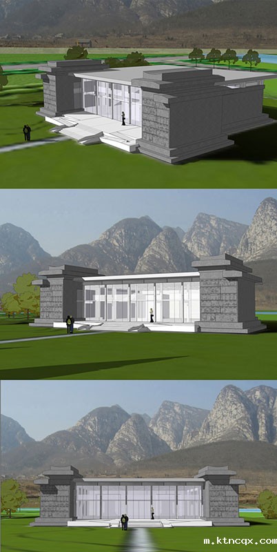 保护性建筑设计则在保护好阙的同时,突出其作为少室山庙大门这一重要文化价值。建筑外型模拟双阙,中部设置通透的展示大厅,采用开敞的大玻璃幕墙衔接室外环境,展厅内通过细致的视线设计,不仅可以仔细观察阙体本身的雕饰,而且可以无遮挡观赏双阙全景和远处的少室山,充分展现少室阙与少室山的对景关系。