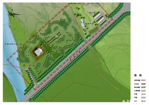 在少室阙少林古道以北的建控地带内,顺应现状地形高差,形成多层台地,分层设置小型管理服务区和小型停车场。服务用房采用地方特色建筑窑洞靠近停车场一侧建设。少室阙与少室山之间的景观视廊,保留农田和低矮灌木,禁止新建建筑物;并采用种植高大乔木的方式遮挡展示区外围的公路、村庄房等,屏障交通噪音、粉尘等干扰,使保护区内保持较独立、安静的氛围。