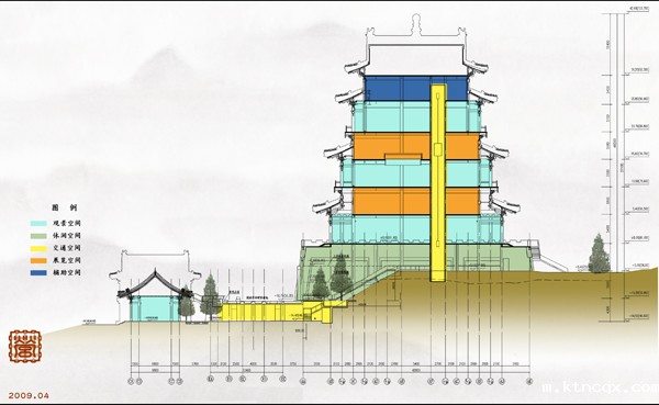 目前历史上的城台已经缺失,本方案根据史料找到了城台原有标高为60.05米,采用架空通透的形式,弥补缺失的景观,同时表达出城台的沧桑变化。