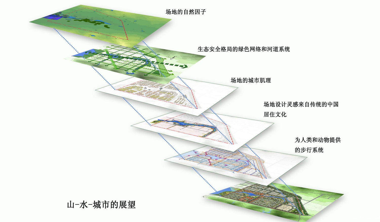 以中国传统的理想宜居需求为出发点,从中国古代山水诗画、古代风水格局中寻找场地内的山水佳穴,并将新城与周围山体、海湾整体构图,梳理场地的山水文化肌理,为后期的城市绿色空间网络构建提供人文依据。