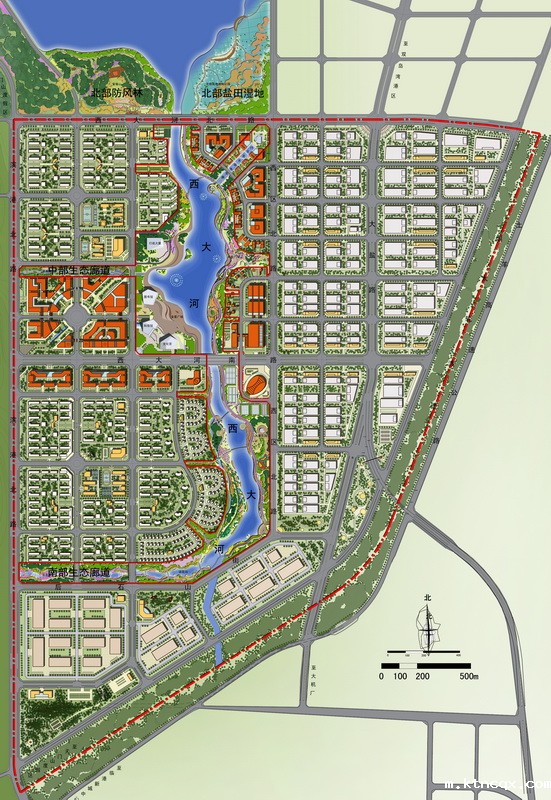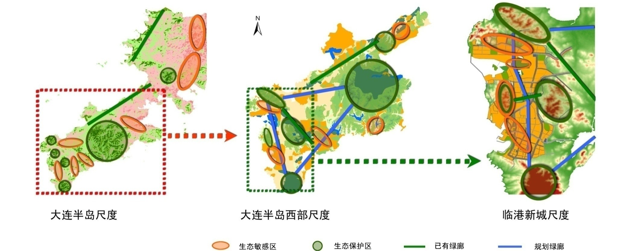 我们从大连市区、大连西部及临港新城等多个尺度的生态区域出发,进行逐层探讨和分析,从宏观层面进行大格局的判断,在微观层面落实具体的分类和措施,从而得到该新城的整体生态系统架构。