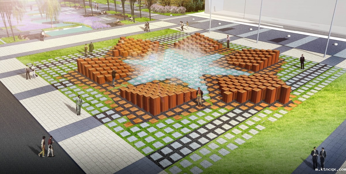 在核能的发现第一部分,用一块隆起的绿地,中间裂开的缝隙寓意核能开始,这部分也是进入园区的具有形象性的大门。第二部分将空间分割成若干私密的小空间,并在里面通过锈蚀钢板镌刻我国核电研究的大事件,这部分作为员工休息、思考的小空间,与第一部分形成对比。第三部分位于主楼中央,是全园的核心,通过1000个堆芯的大地艺术表现核能的特质,同时也隐喻千人计划的合作。第四部分为清洁的生活,通过银色不锈钢板制作的树池、花钵表达清洁能源为人们带来的美好生活。最后一部分为安静的林下沙地,表现未来人与自然的和谐共处,结尾用高起的地形来阻挡来自外界的干扰,地形的景墙上刻有公司的理念:三和文化。