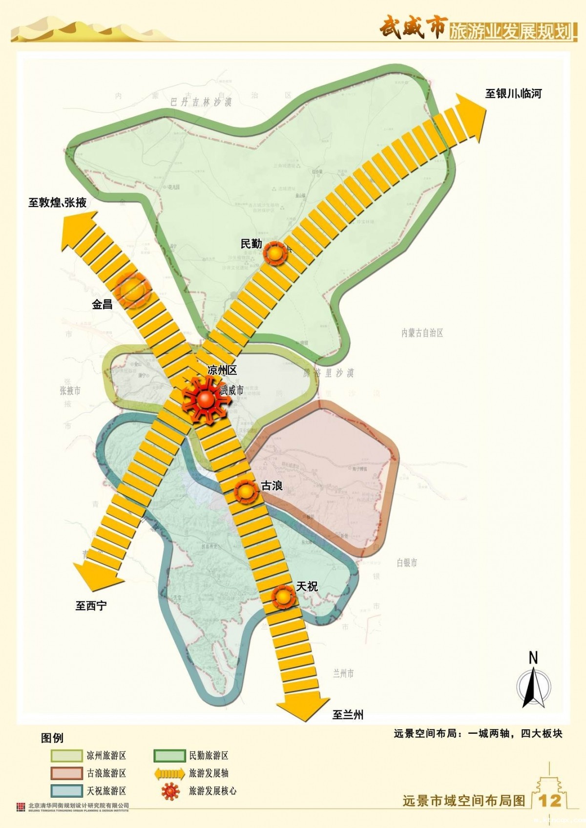 武威地处河西走廊的东大门,具有多元的地貌和丰富的历史文化。通过文化梳理,总结出中原边塞文化和多民族碰撞、冲突、交流和融合文化是其两大特色;通过“丝绸之路文化旅游”、“佛教文化旅游”、“沙漠专项旅游”、“自然生态旅游”、“葡萄酒旅游”和“红色旅游”等6大专题,对武威进行全方位的比较和定位。在此基础上,提出“科学发展、生态安全”、“政府主导、多方借力”等6大发展战略,规划“一带一城”向“一城两带”总体格局的变化,“中国旅游圣地”、“丝路•凉州传奇”、“大漠•祁连山”和“乐活凉州”四大产品体系,以及“马踏飞燕•中国旅游圣地”、“丝路重镇•凉州古城”、“金漠国际•世界沙漠生态旅游新地标”等四大类十个重点项目。