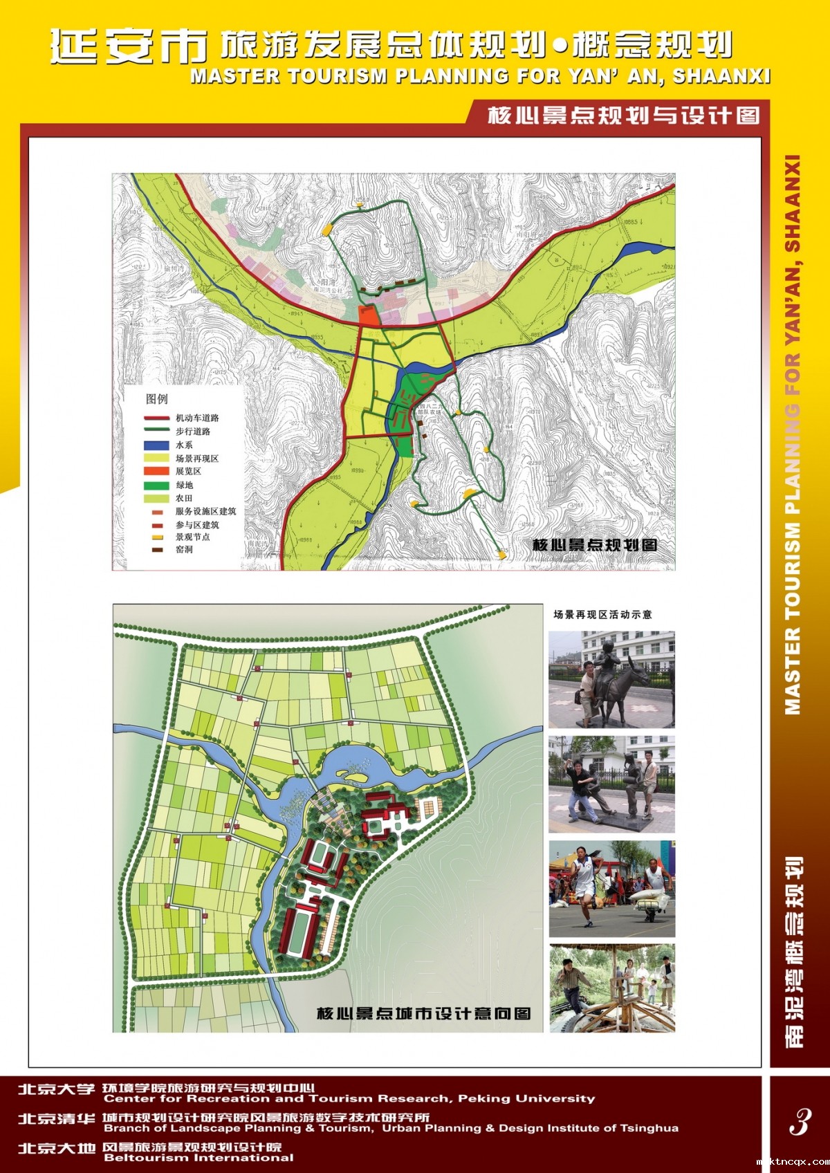 概念规划是旅游发展规划在特定区域或旅游地的意向性落实,是景区建设规划的指引,是旅游发展规划和景区建设规划之间的桥梁。规划选取了延安市中心城、南泥湾、黄河乾坤湾和黄龙县4个旅游地进行概念规划。这些规划点的选择分别从不同的角度,对延安市不同的旅游地类型——城市旅游、红色创新旅游、黄河与黄土风情旅游以及县级区域旅游,进行了示范性的规划。这不仅为这4个旅游地提供了意向性的具体规划,也为延安市同等类型的旅游地规划树立了示范的模板。
