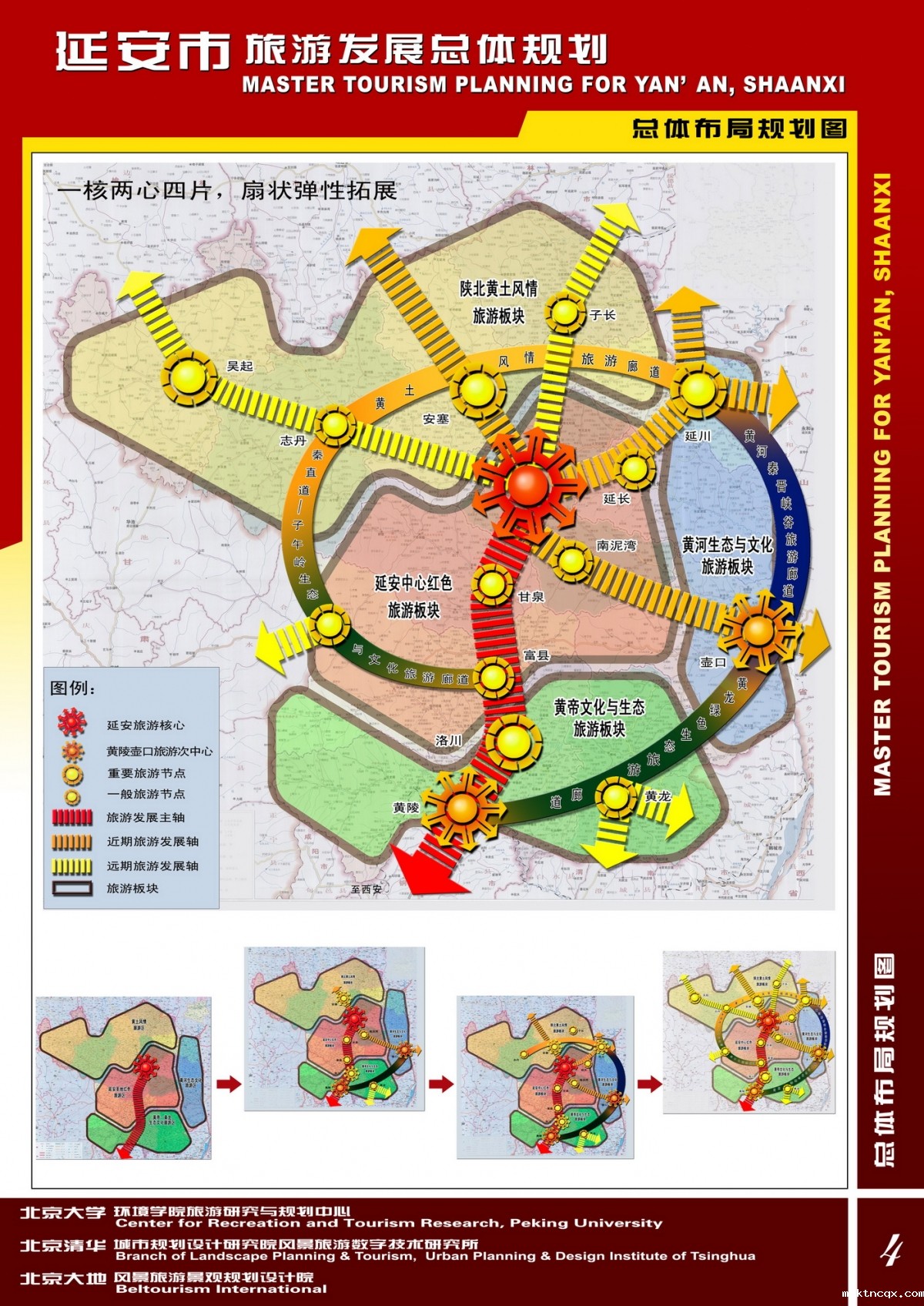 本规划面向综合性红色旅游目的地城市的发展方向,以红色旅游为核心,形成“两圣两黄(红色圣地、民族圣地、黄土风情、黄河风情)”的产品体系,构建“一核两心四片、扇状弹性拓展”的空间发展格局,全面实施“红色圣地”、“品牌驱动”、“中枢联动”、“遗产共营”、“三位一体”五大战略,差异化发展4大板块——延安中心红色旅游板块、黄帝文化与生态旅游板块、陕北黄土风情板块、黄河生态与文化旅游板块,打造7大世界级旅游品牌、8大国家级旅游品牌,将延安建设成为区域性的旅游中心城市,中国红色旅游第一目的地(红色遗产之都、红色教育之都、红色魅力之都和红色产业之都),中华民族寻根朝圣的首选地,中国最具魅力的黄土风情和黄河文化旅游地。并对延安市13个县区提出了发展导引规划。