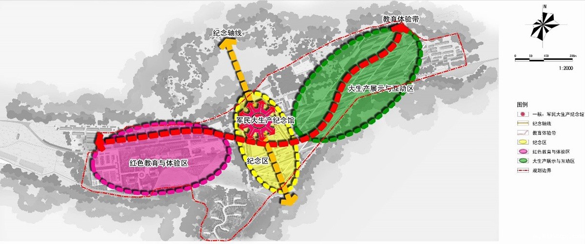 军民大生产片区形成“一核一轴,一带三区“的空间布局结构。一核是指军民大生产纪念馆;一轴是指南北向纪念轴线;一带是指东西向的教育体验带。三区包括纪念区,红色教育与体验区,大生产展示与互动区。策划出军民大生产纪念馆、军垦广场、军垦纪念田、景观种植田、农耕屯垦纪念馆等重点项目。