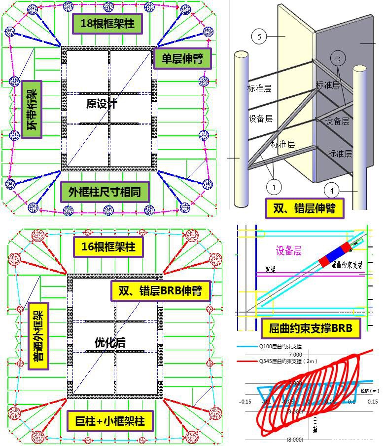 我中心对该项目的结构体系进行了大幅度的优化,显著改善了建筑通透性及结构的抗侧效率。该项目还采用了我中心的专利--错层伸臂布置技术(专利编号:ZL2014 2 0479555.4),节点应力显著减小,节点设计更简单,节点施工更加便利。