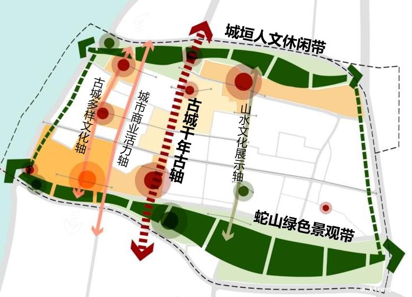 立足于古城保护的基础上开展古城整体利用提升工作,从全局到地段逐级厘清城市发展结构,盘点存量用地及资源,从用地布局到古城内外交通配合,公共服务设施的全面配套,居住环境的改善提升,古城北片风貌的引导控制,系统建立蛇山北片区的全面提升与发展的结构与体系。