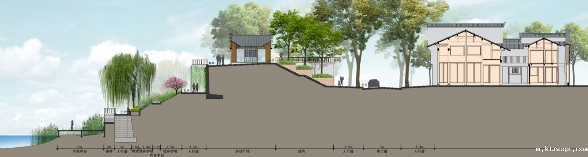 面对这两个问题,项目组进行了大量研究,从真实性和完整性两个角度否定了复建古城的思路,并认为老城地区最缺少绿地开放空间,应该把这个区域作为公园绿地使用。确定了这一方向后,项目组积极与景德镇市委书记、市长、开发公司、市民沟通,用几个月的时间,使全市上下同意了停止复建,坦荡还绿的思路。在设计手法上,通过整体覆土的方式,在4米高的风光带顶部形成了宽度30米的绿化带,布置上下联动的多样化活动设施。