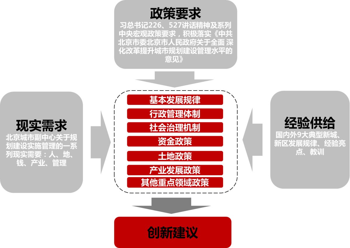 本研究通过案例研究系统剖析典型新区发展中积累的典型经验,突出亮点。结合北京城市副中心特点,按照新的发展要求与发展理念,针对重点方向提出相应发展策略和政策建议。形成了系统化特色工作框架,构建由案例研究—提取亮点—对策建议的路径。强调“三个突出”“两个转变”: