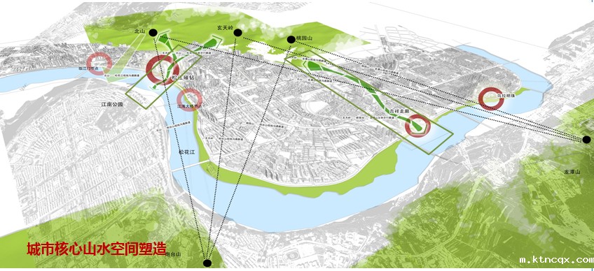 景观策略方面,综合提出空间魅力丰富的景观之城发展目标,主要包括城市视线廊道的空间控制、滨江开放空间与天际线的组织、均衡的开放空间体系、主题鲜明的城市路径、魅力十足的地标体系五个方面的策略。功能策略方面,综合提出包容多元的活力之城发展目标,主要包括商业服务的均衡分布与档次提升、高端城市公共职能的有效植入、文化消费产品的整体完善。文化传承方面,综合历史文化传承的气质之城的综合愿景,提出"吉林幸福指环"文化环廊和大松江文化体验带的核心文化组成。城市触媒方面,综合提出引擎项目带动的魅力之城的发展目标,主打三个核心引擎项目区域:松江璀钻、吉祥走廊、乌拉明珠。