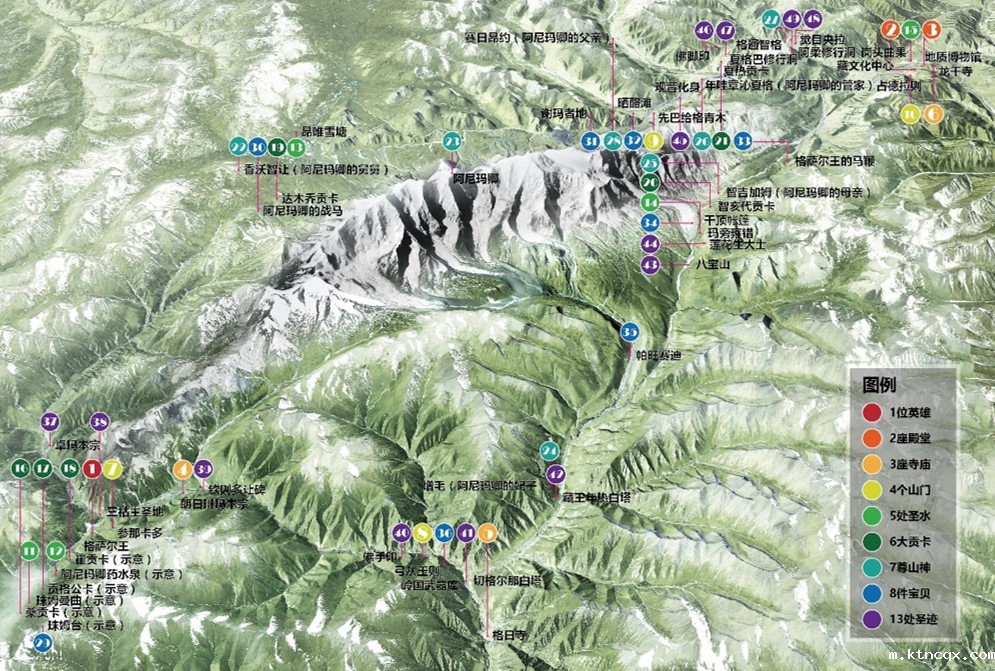 大神山,贯彻神圣神山的理念,梳理49处圣迹,强化神山的神圣性;通过对神山文化的梳理,将阿尼玛卿雪山的圣迹分为阿尼玛卿山神相关圣迹、格萨尔王相关圣迹、藏传佛教相关圣迹等,并进一步筛选出有代表性、可见度高的49处圣迹展示神山体系。