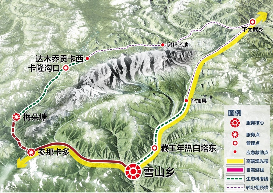 大震撼,打造雪山五大亮点,塑造雪乡圣寺、云霄揽胜、雪山摘星、梅朵花园、日照金山等明星产品,强化神山的影响力。
