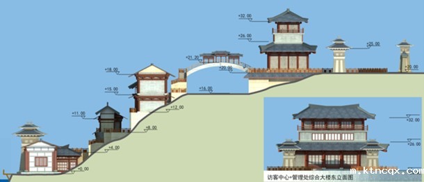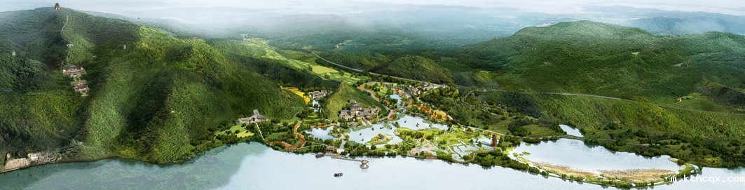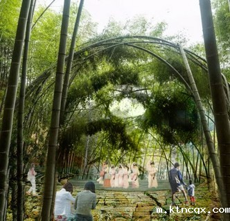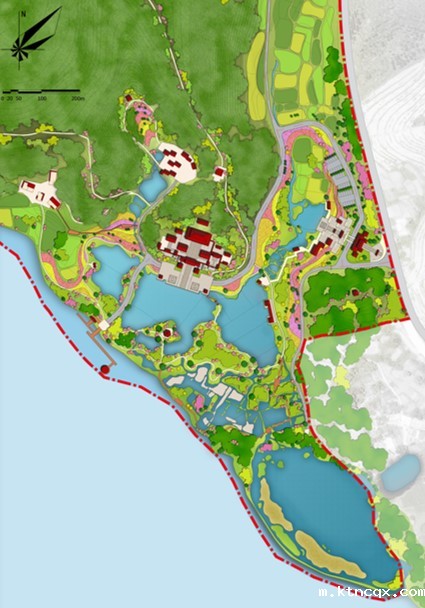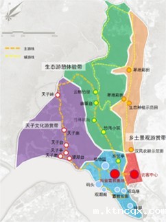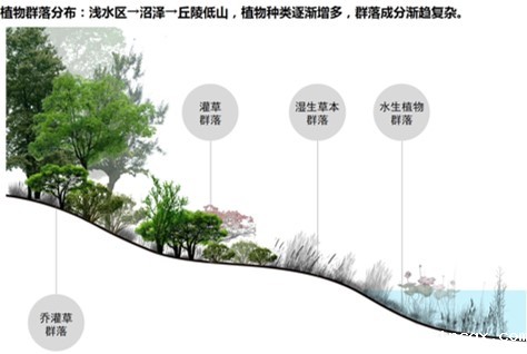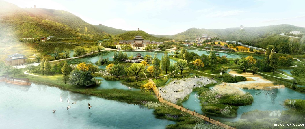 规划区整体结构为“一核三带,”“一核”为管理服务区和宣教展示区,采用引水还湿、汉风点缀的布局方式,利用山形地势建造两处结合造型和功能的跌落式台地建筑;同时在最高洪水位以下,以景观营造为主,退耕还湿,营造五彩果林、稻田菽浪、生态岛链等生态景观,利用户外湿地展示,既恢复了动植物生境,又可以实景展示湿地生态系统的结构和功能。“三带”则为游赏带特色鲜明、为游客提供多样游览体验的天子文化游赏带、竹林生态游赏带和乡土景观游赏带。