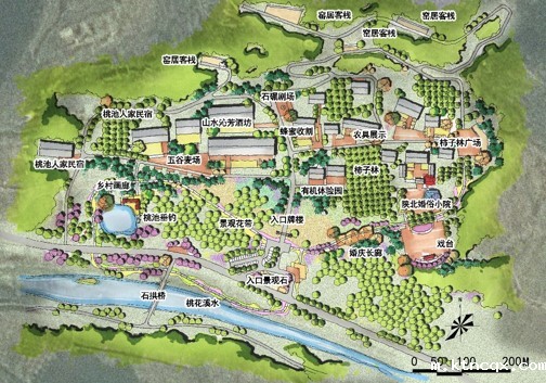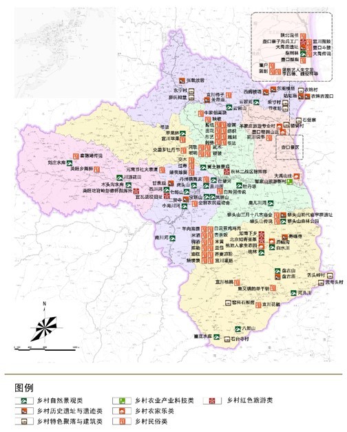 规划构建了“四区九点·两带两环”的空间发展格局。“四大片区” 分别为东部的黄河民俗风情区、北部的高原果香体验区、西部的川道田园休闲区和南部的森林生态度假区;“九点” 为九大乡村旅游重点项目,包括依托川道农业、苹果种植业等农业产业基础的三大农业型旅游节点:陕北农耕文化园、七彩川道、乡村婚庆公园,和依托宜川特色村落以及非物质文化遗产的六个乡村型旅游节点:昝家山·黄河鼓舞文化传承地、桃枝村·桃池人家摄影美村、太平窑居度假村、舌头岭·黄河非遗小村、羊家庄·陕北美食体验地、永宁耕读文化古村;“两带·两环” 分别为依托宜川县两条旅游交通干线的南北向沿黄乡村旅游发展带和东西向川道乡村旅游发展带,以及结合宜川地形地貌、景观特色的北部黄土黄河风情环线和南部森林绿海生态环线。