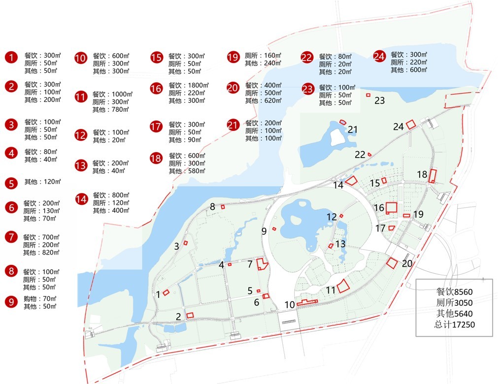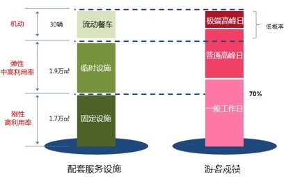 规划基于标准平均客流10-15万人/天,设计日客流15-19万人/天,高峰客流19-24万人/天的客流基础,通过定量定性相结合,以及案例和规范参照法,测算餐饮、购物、厕所及其他相关服务设施的规模总量。规划提出“按需定量,适度集中”、“兼顾平峰,弹性应对”、“便捷服务,满足需求”、“集约复合,构建分级单元”、“统筹会后,兼顾运营”以及“特色突出,强化园艺主题”等六个布局思路。在此基础上,规划对餐饮、购物、厕所及其他9类服务设施进行空间的规划落位。同时,各类设施在空间分布上既满足服务半径要求,同时兼顾固定、临时和可移动设施的匹配与平衡,从而满足会期游客的各类服务需求,提供经济、便捷、高效的世园会配套服务设施。