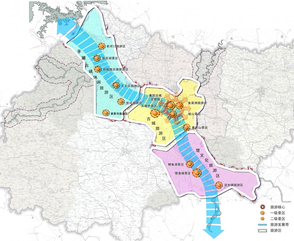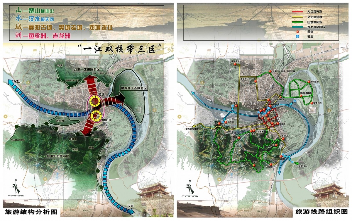 规划确定以汉水文化和襄阳古城为核心吸引物,联动“汉水、楚山、古城、乡村、盛事”五大主题产品,构建“一带三区,核心带动”的空间格局,通过“联动双武,整合周边”;“文旅双馨,品牌带动”;“远近并举,两端突破”;“多元一体,复合发展”;“科学保护、永续利用”等五大发展战略,精心打造集水上观光、休闲、度假、运动、民俗等多元化的复合旅游产品体系,并推出以“畅游汉水”、“山水襄阳城”、“智慧古隆中”、“浪漫解佩渚”等为主的十二大品牌产品。