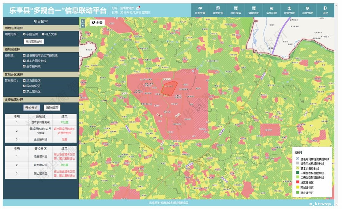 在进行重点建设项目预选址阶段审查时,提供多规合一编制成果和各部门专项规划的管控要求审查,满足各部门审批人员对各部门规划的管控要素的查询需求,解决审批人员在查询项目所在位置的各类规划时“获取难”的问题;同时,在重大建设项目落地选址时,提供基于空间位置的分析决策功能,综合考虑多规管控要求、各部门规划要求、交通条件、现状情况、周边环境影响等因素,满足多规应用部门对重大建设工程的选址需求,解决政府部门因“大海捞针”式的翻文本、翻图纸的找地块,或“算命先生”式的“掐指一算”找地块而导致的选址不合理、项目无法落地等问题。