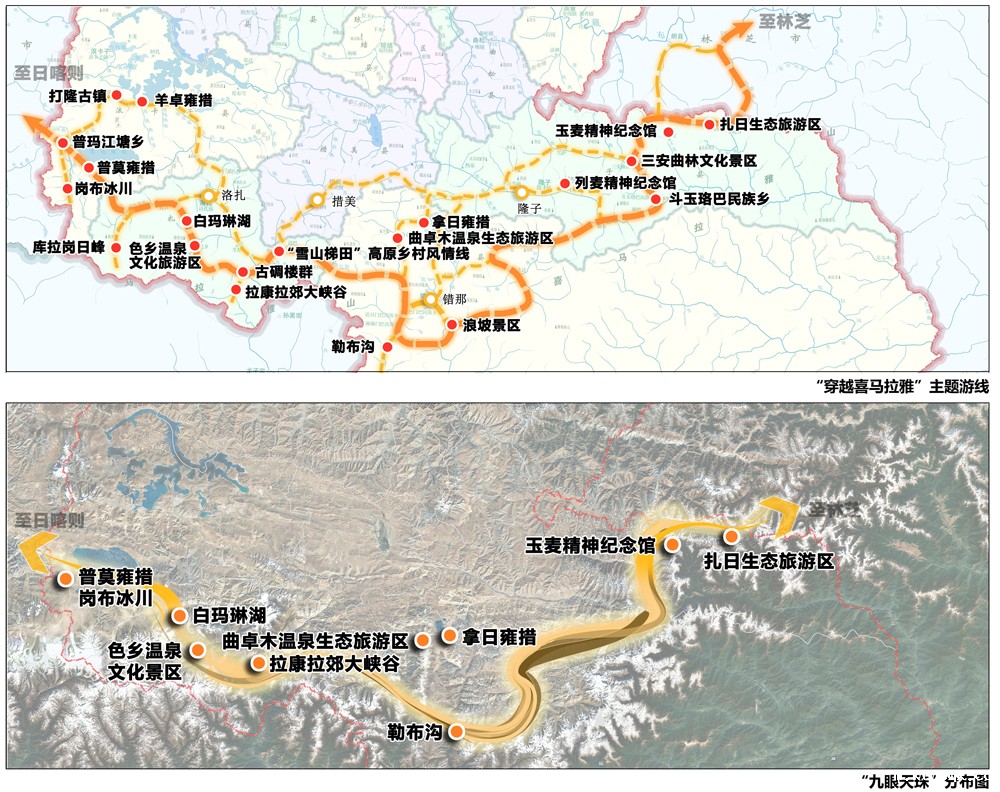 规划提出山南市全域旅游建设以“一核四线”为抓手。一个文化核心区,即藏源文化景区。四条主题游线即“畅游雅鲁藏布”主题游线、“穿越喜马拉雅”主题游线、“尽览世界屋脊奇观”主题游线和“最美国家地理公园”主题游线,并分别重点打造以“吉祥八宝”、 “九眼天珠”和“十五莲花”为典型代表的精品景区。