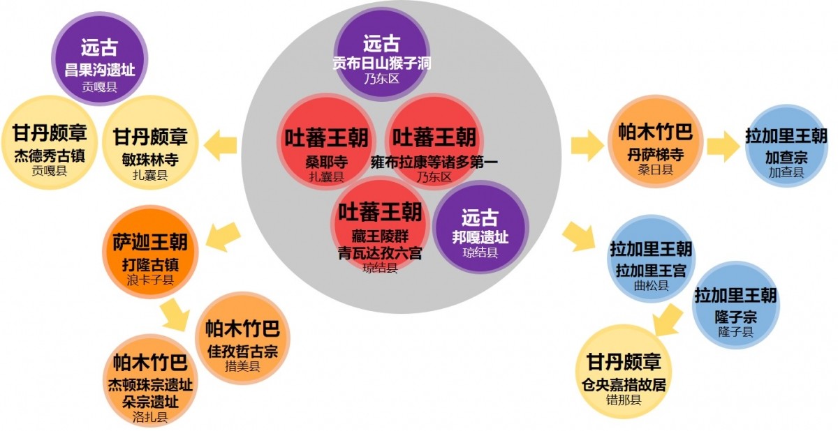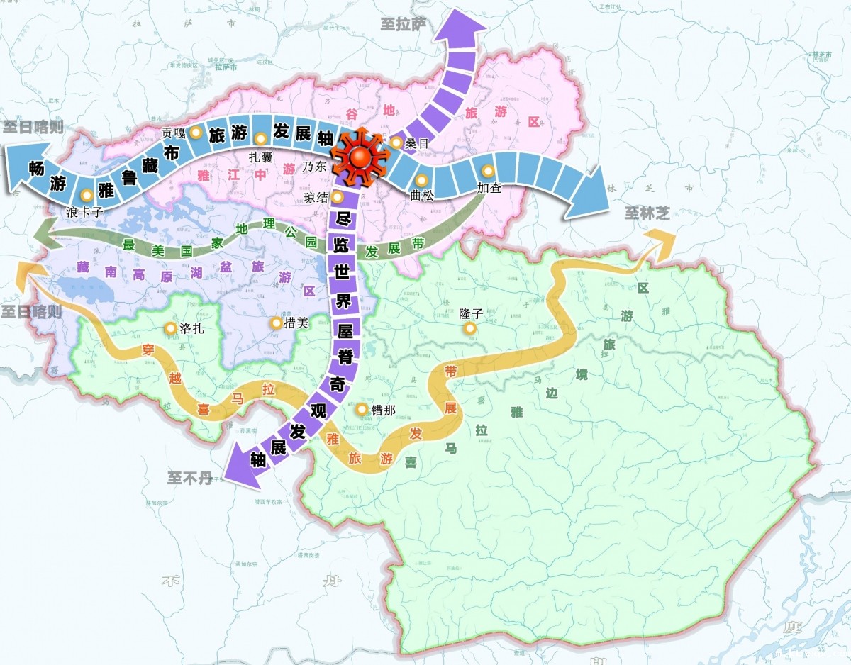 规划构建“一核两轴两带三区”的空间发展格局。一核即藏源文化发展核,包含乃东区、琼结县和扎囊县;两轴即畅游雅鲁藏布旅游发展轴和尽览世界屋脊奇观发展轴;两带即最美国家地理公园发展带和穿越喜马拉雅旅游发展带;三区即雅江中游谷地旅游区、藏南高原湖盆旅游区及喜马拉雅边境旅游区。