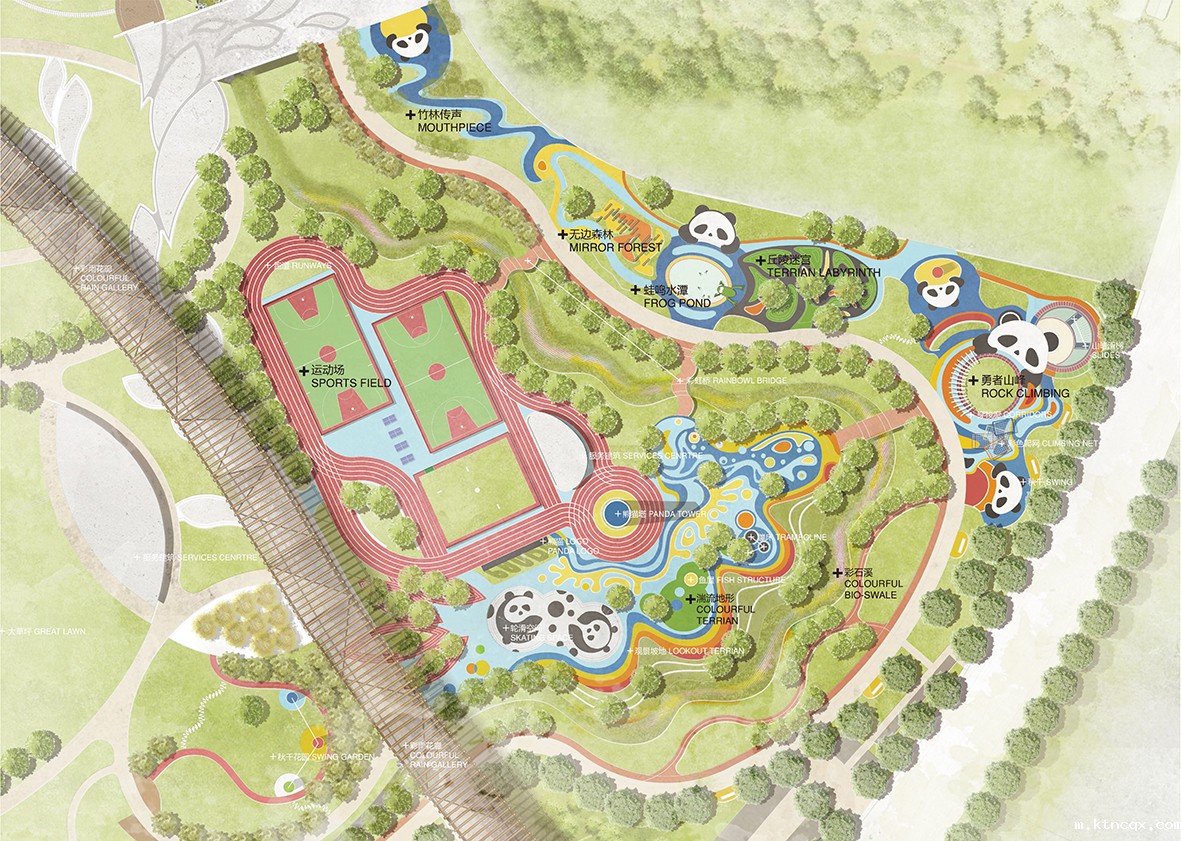 熊猫绿岛公园位于四川省雅安市新老城之间的水中坝岛上,公园规模22.68公顷。经过对雅安市摸底调研后,发现雅安市严重缺乏适合儿童的户外活动场地。为了给儿童们提供一块更安全、更具启发性、更高品质的活动场地,设计团队特意辟出2.3公顷土地设计了一片熊猫乐园。