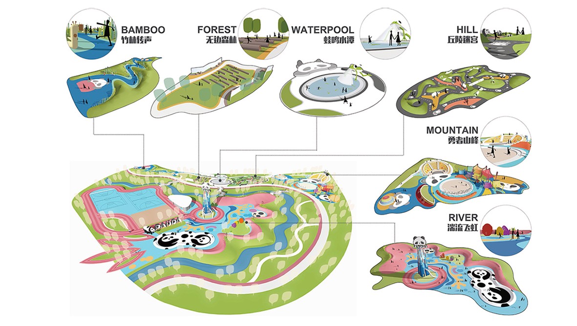 设计方案还以雅安丰富多样的自然生态环境为灵感,提炼竹林、森林、水潭、丘陵、山峰、河流等6种自然场景特征为设计语言。通过小品、地形、水景、铺装纹样等方式,模拟6种自然环境空间并植入特色活动项目,呈现出不同场景和活动空间。孩子们在这些场地中玩耍、互动,在游戏的过程中“声”、“触”、“视”、“体能”、“方向感”和“平衡感”等方面得到锻炼。