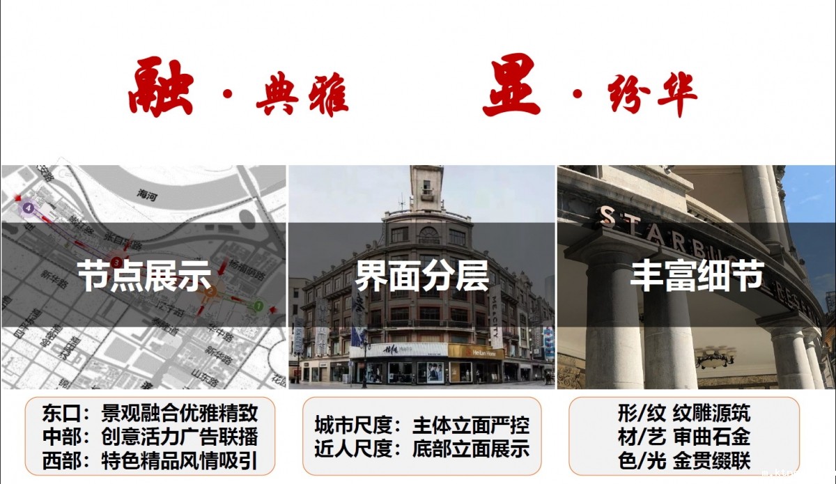 (三)彰显文化:营造具有浓郁文化底蕴的城市公共空间。从和平路文化特征出发,全面提高步行街建筑物立面与街道景观品质,营造具有文化分位的城市公共空间环境。